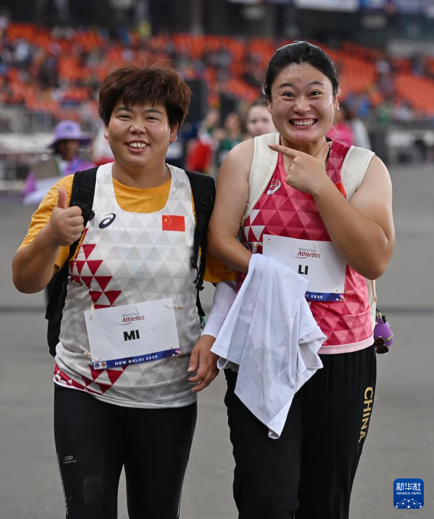 10月5日,中国选手米娜(左)与李英粒在女子铁饼F38级决赛后庆祝。他们分获亚、季军。