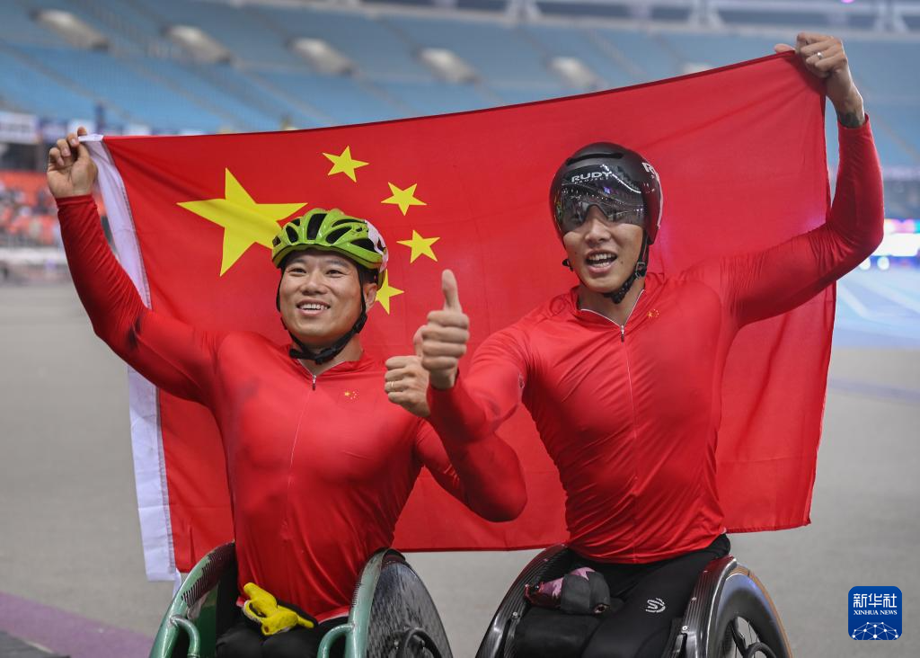 10月5日,中国选手金华(右)与代云强在男子800米T54级决赛后庆祝。他们分获冠、亚军。